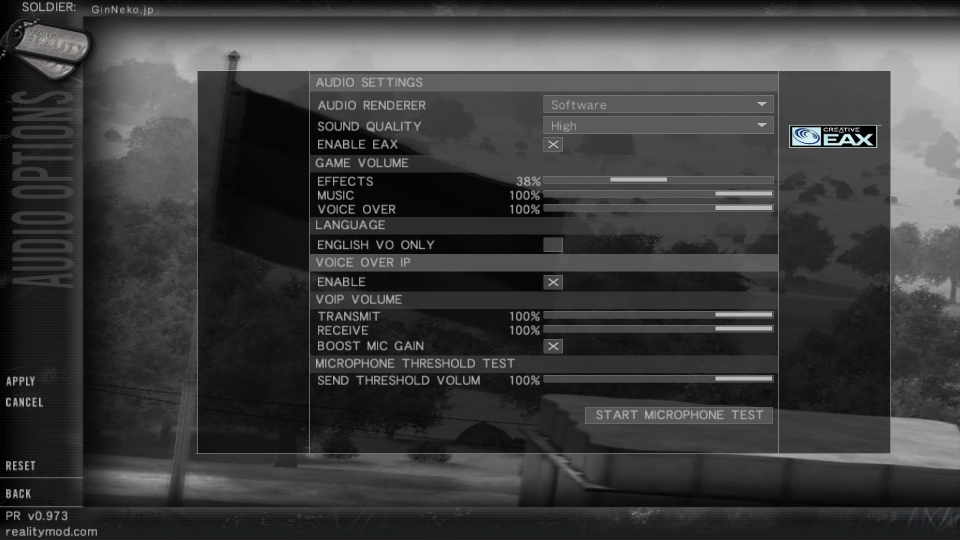標準の入力デバイスにマイク入力が設定できたら、次にBF2内での音声の設定を行います。